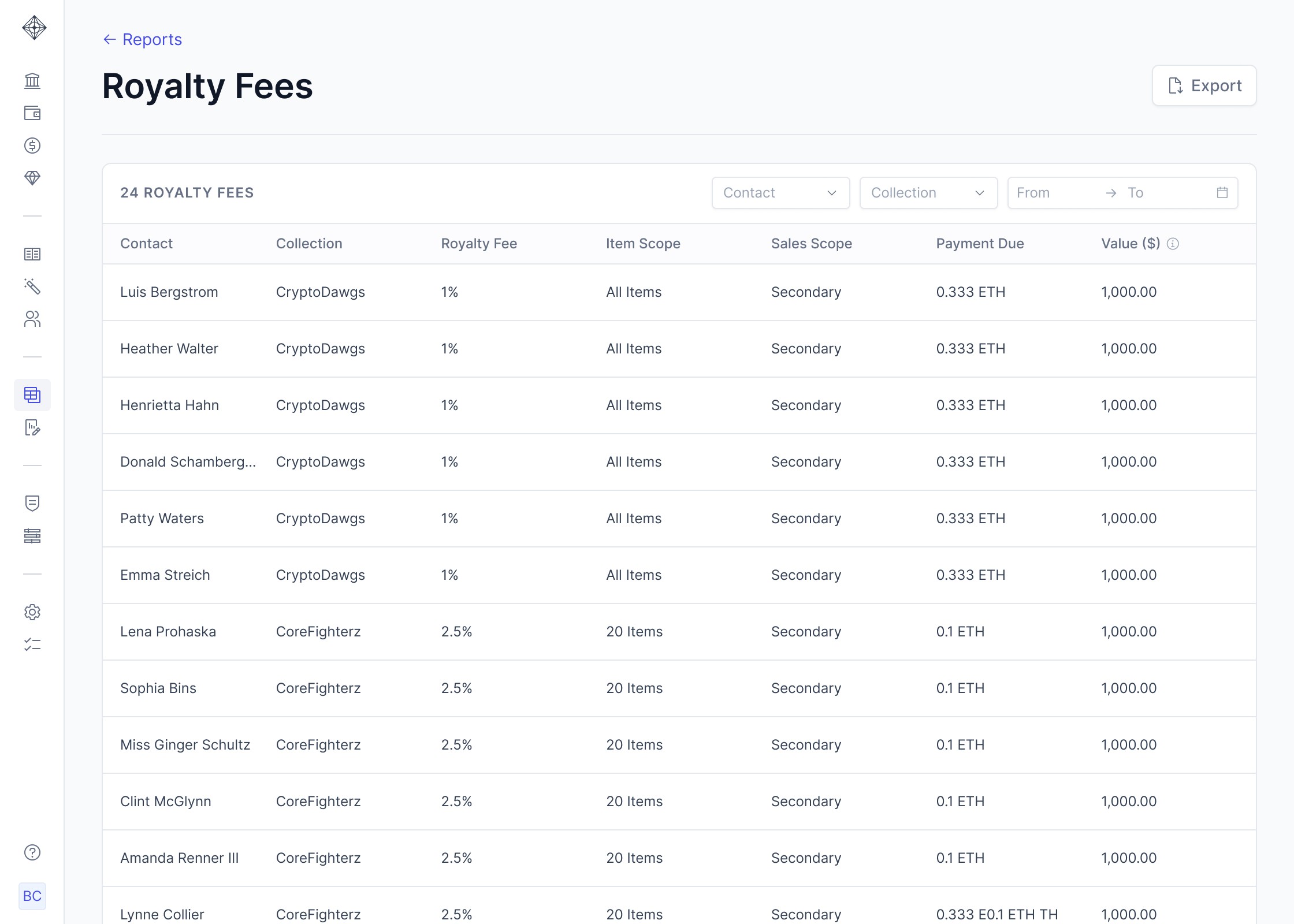 This is where the need for automation becomes apparent. Integral’s new feature addresses these challenges head-on with automated royalty calculations. By using a rule-based system, the feature efficiently manages the various conditions for calculating royalties. Each NFT collection can have specific conditions, such as the beneficiary and fee percentage. Integral’s system also allows users to generate reports, showcasing the royalties owed for each rule created in each collection.