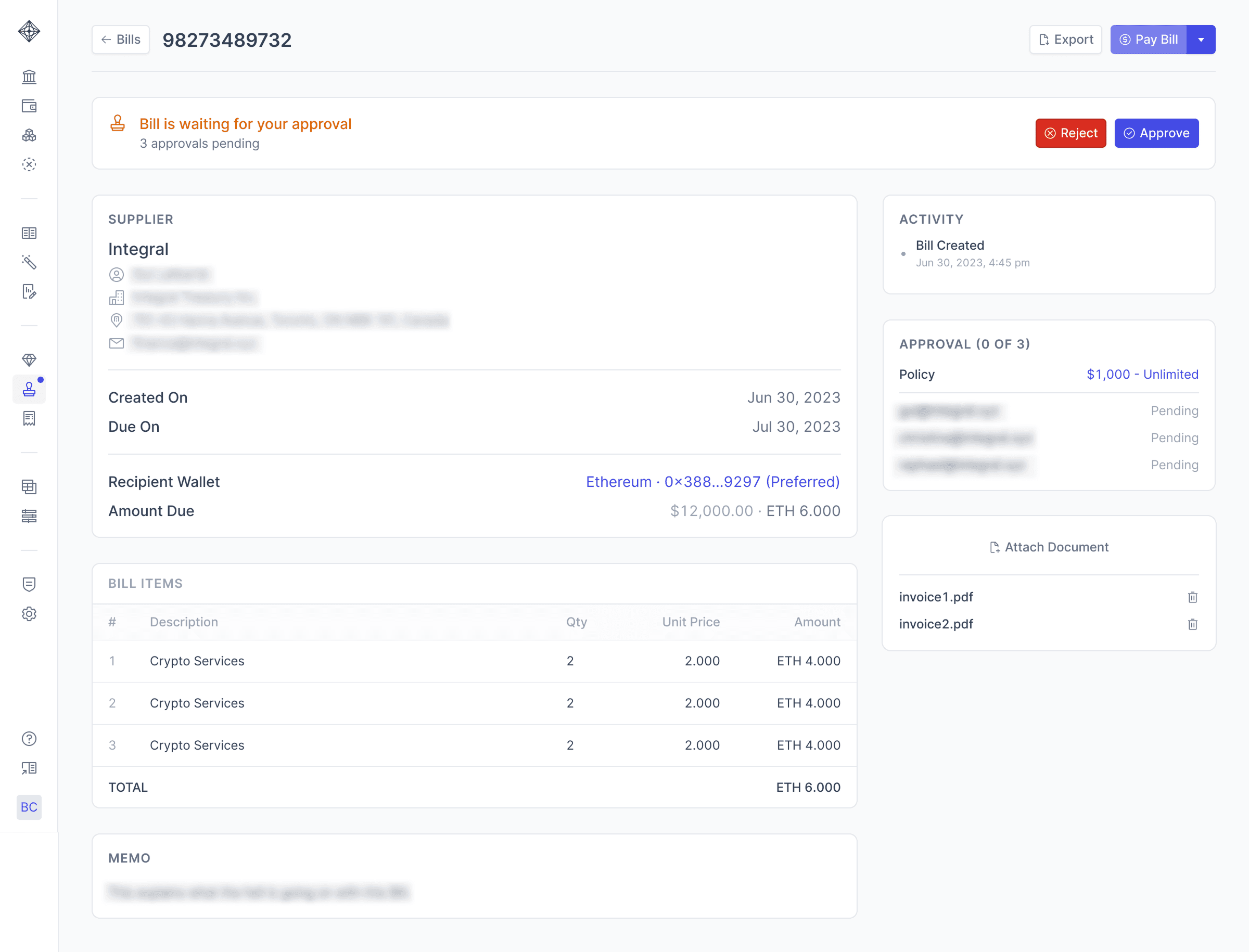 Note: One of Integral’s standout features is its direct QuickBooks integration. This lets you import your Chart of Accounts and vendor/employee lists for easy bill creation and categorization—no more copying and pasting wallet addresses or reference numbers.