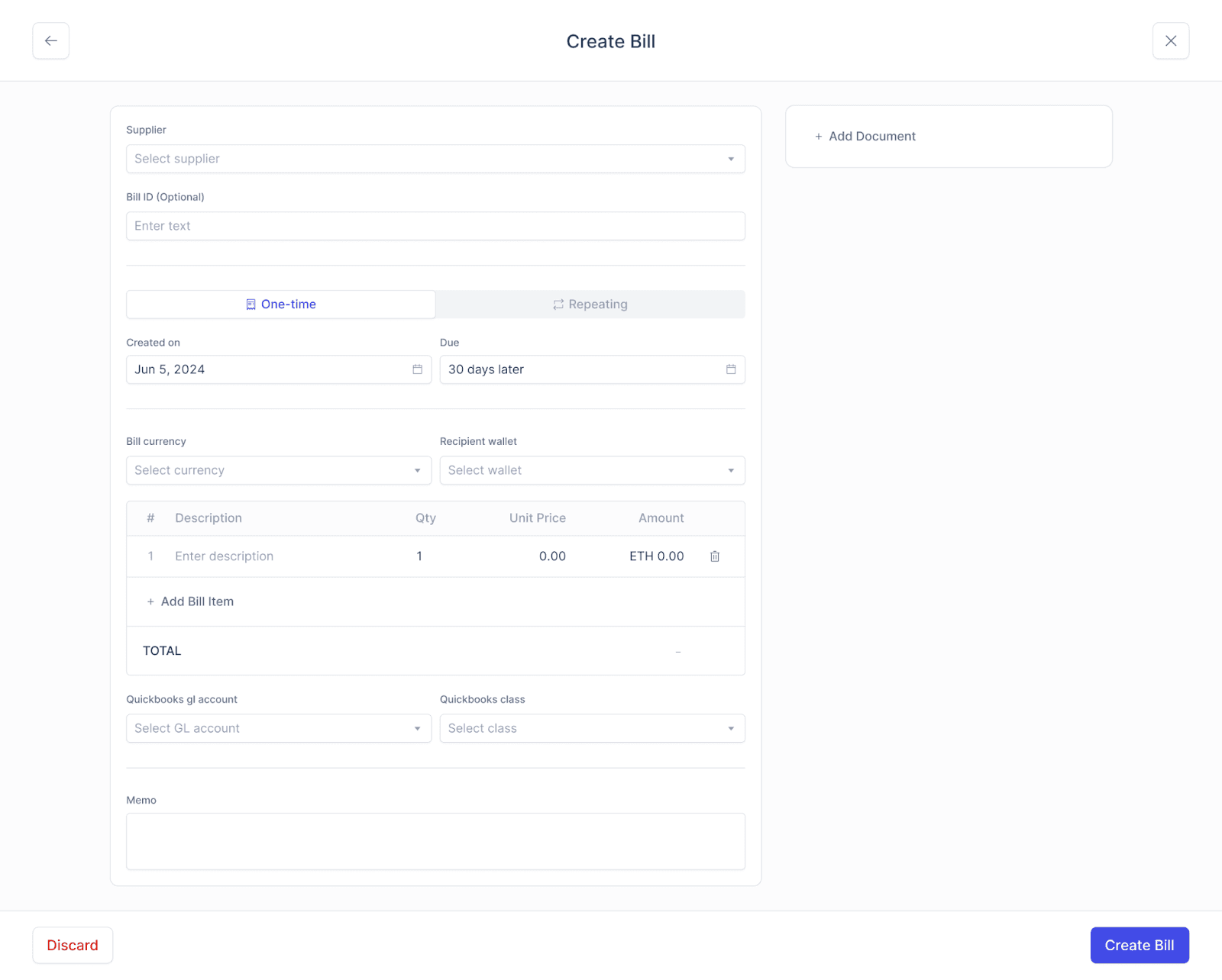 Once you’re adding a bill (for payroll or payables), the following fields can be filled in: