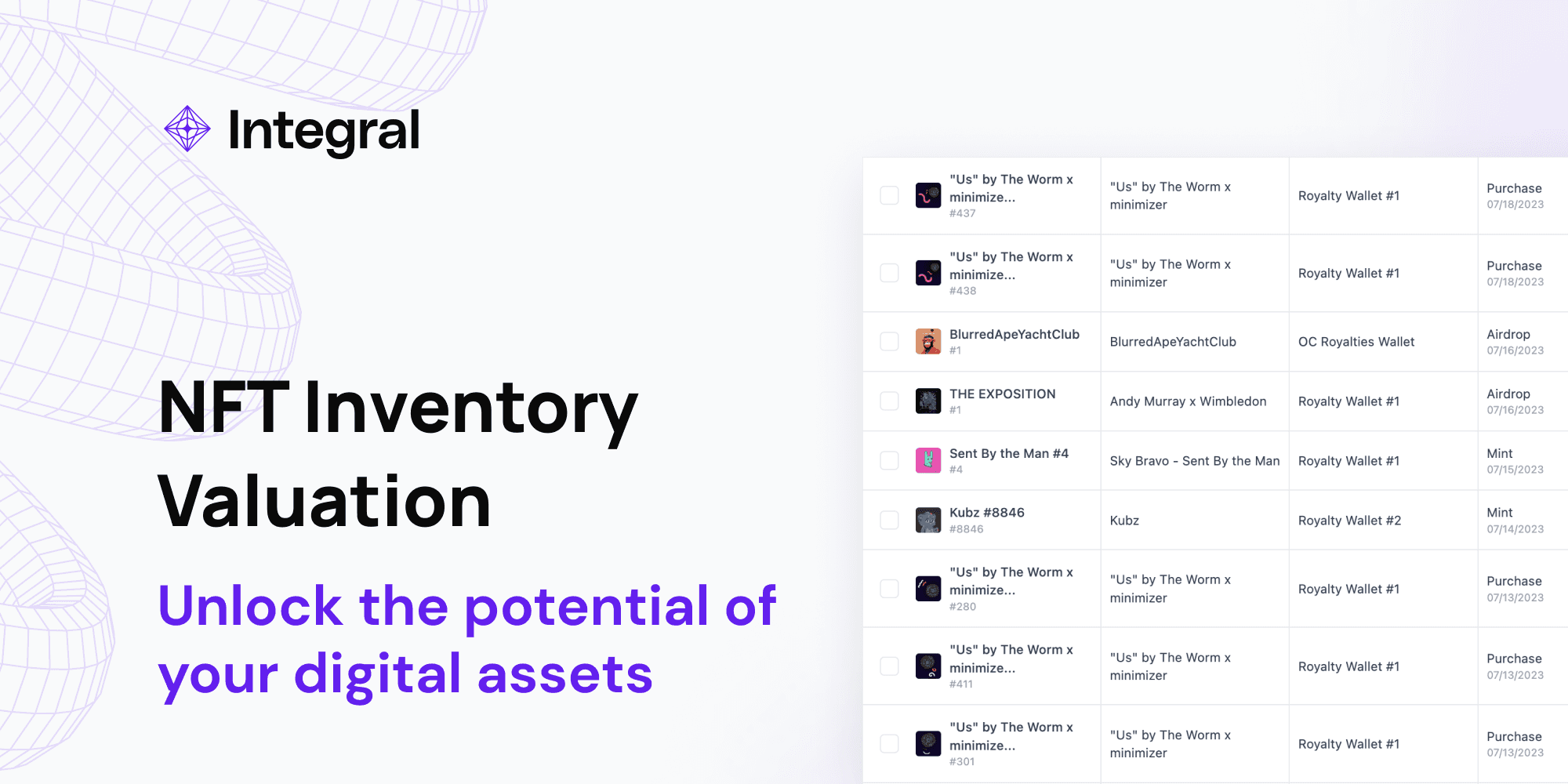 Unlock the potential of your NFT inventory with Integral's NFT Inventory Valuation feature – a powerful tool designed to give you confidence, efficiency, flexibility, and transparency in the ever-evolving world of digital assets.