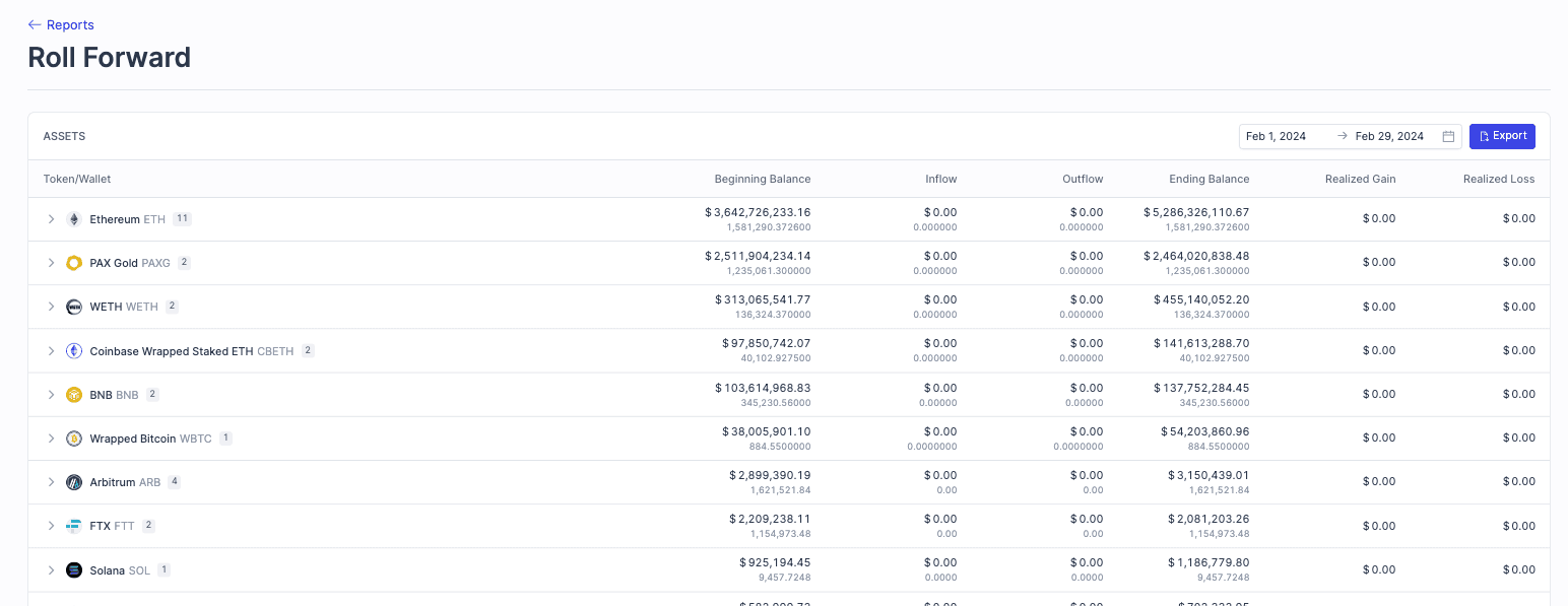Complex Transactions: Crypto transactions can be complex, involving multiple wallets, exchanges, and even different types of assets (e.g., token swaps). The Roll Forward report breaks down these transactions, providing a clear view of how each action impacts account balances.