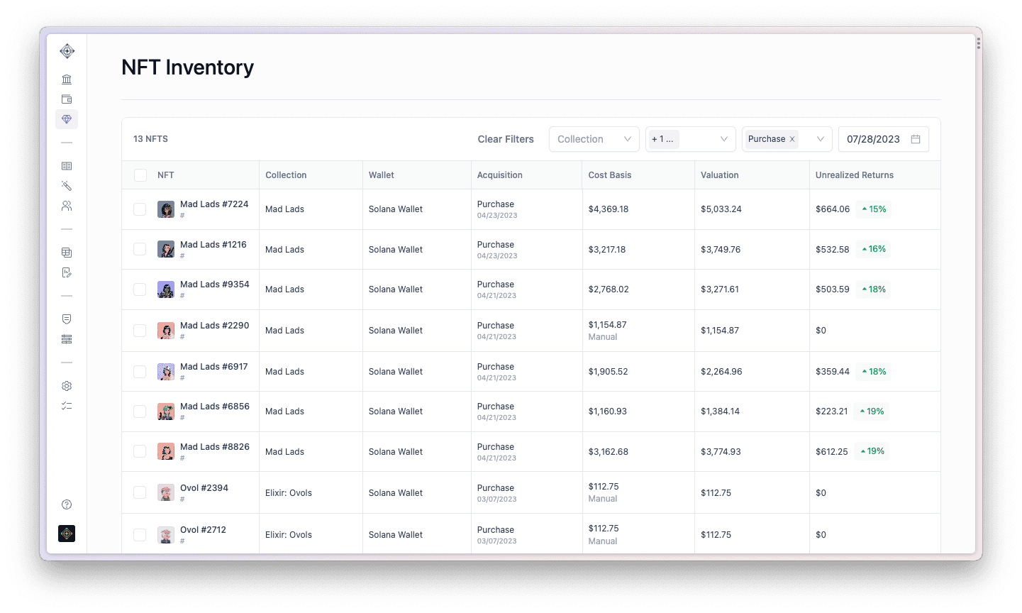 Recognizing the growing prominence of Solana's NFT ecosystem, Integral has added support specifically for Solana-based NFTs. Our enhanced NFT Inventory Valuation feature empowers businesses to make informed decisions and effectively manage their digital investments within the Solana network. Accurate valuation of Solana NFT inventories is pivotal for web3 organizations for various reasons: